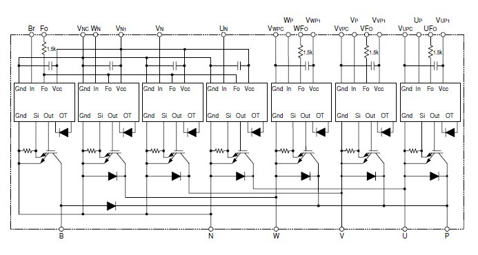 PM75RLA120 features: (1)40A, 1200V Current-sense regenerative brake IGBT; (2)Monolithic gate drive & protection logic; (3)Acoustic noise-less 11kW/15kW class inverter application; (4)UL Recognized; (5)Detection, protection & status indication circuits for, shortcircuit, over-temperature & under-voltage.